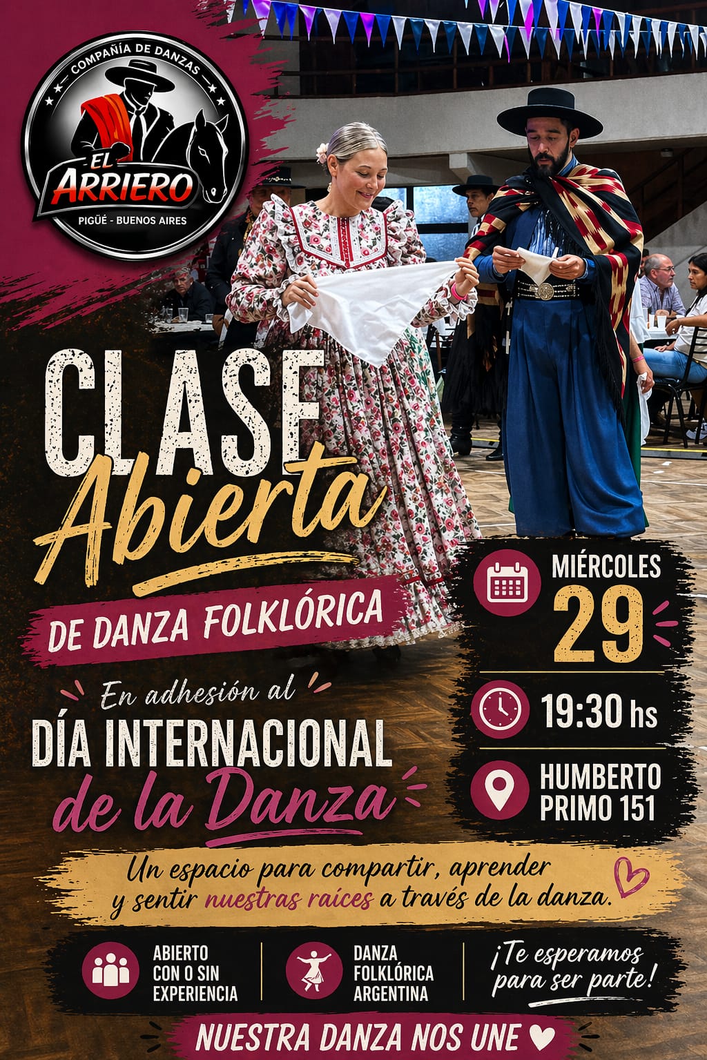 Humberto Primo 151 Humberto Primo 151, Pigüé, Buenos Aires, ArgentinaEn adhesión al Día Internacional de la Danza, abrimos las puertas para compartir lo que más nos mueve: nuestras raíces. 📅Miércoles 29 🕑19:30 hs 📍 Humberto Primo 151 Un encuentro para aprender, disfrutar y sentir la danza desde adentro. No hace falta experiencia...sólo ganas de bailar 💃 Sumate a vivir la danza con nosotros.