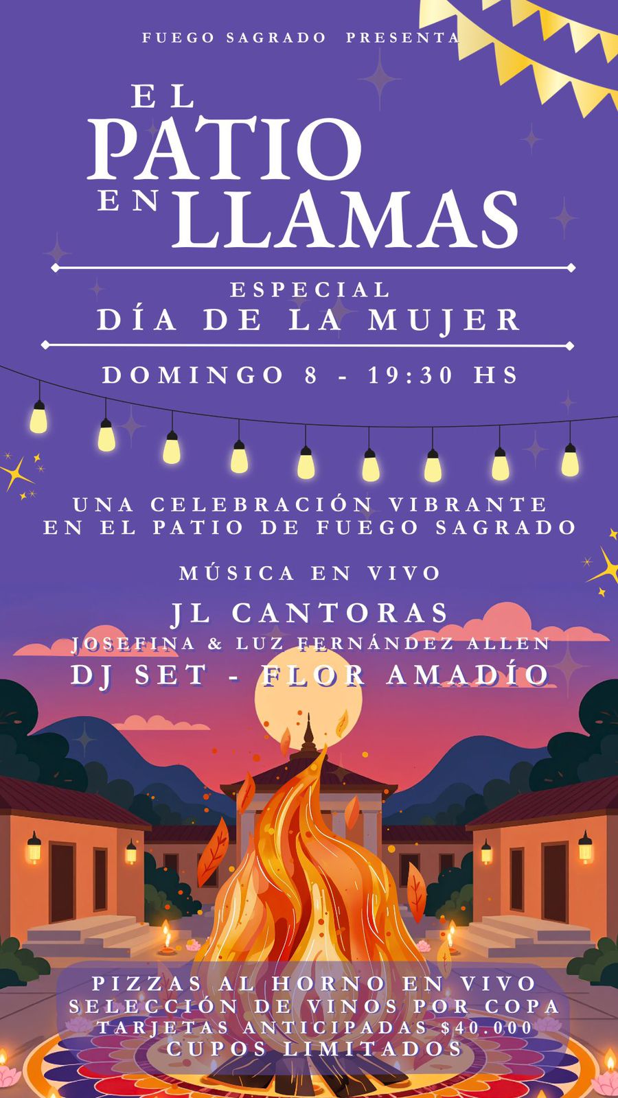 Una celebración vibrante en el patio de Fuego Sagrado Restaurant, este domingo 8 a partir de 19:30 hs acercate a compartir un exquisito plato, música en vivo y DJ SET. Tarjetas anticipadas $ 40.000 Cupos limitados -