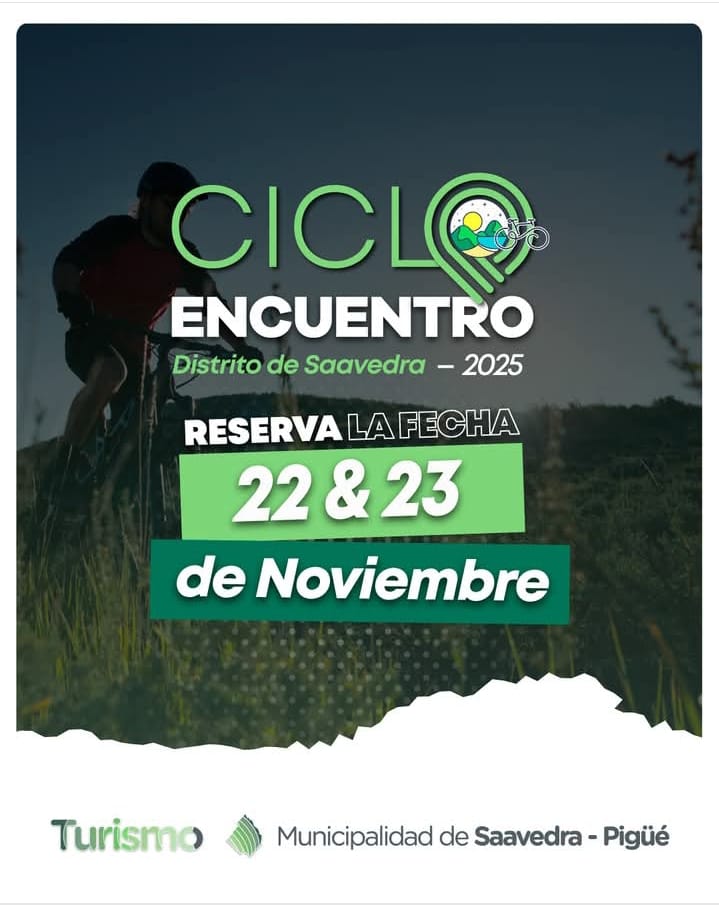 2° Ciclo encuentro del Distrito de Saavedra - Edición 2025 🚴♀️🚴♀️ ¡Una experiencia única en dos ruedas para recorrer nuestros paisajes 🌳⛺💧 📅 22 y 23 de noviembre 📍 Base de encuentro: Parque Municipal de Pigüé 📌 ¡Agenda la fecha! Muy pronto abrimos las inscripciones 👈