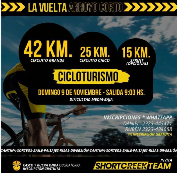 Desde la localidad de Arroyo Corto invitan a compartir una actividad de cicloturismo 🚲 el día 9 de noviembre, a partir de 09:00 am desde Plaza "9 de Julio". 📌Agendalo 🧢Casco y buena onda obligatorio 📳 Inscripción gratuita