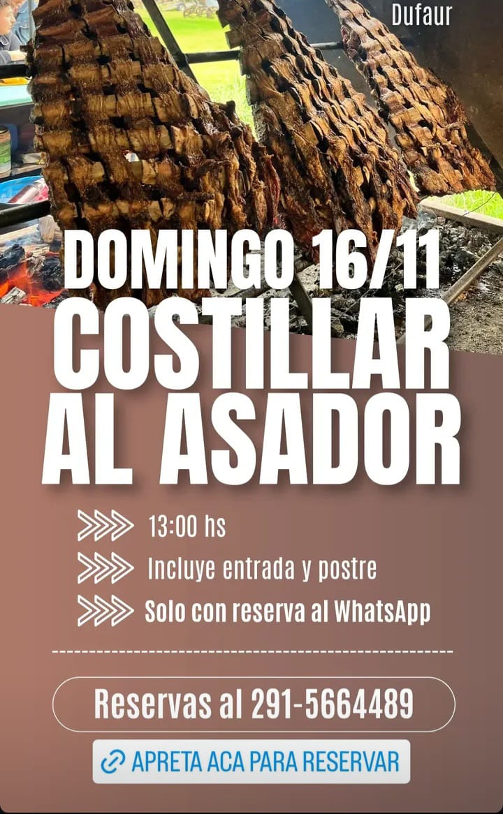 📌El próximo domingo te invitamos a degustar el riquísimo costillar al asador en Almacén La Moderna de la localidad de Dufaur 😛 Incluye entrada y postre 🥟🍰 Acordate de reservar con tiempo📞 Cupos limitados.