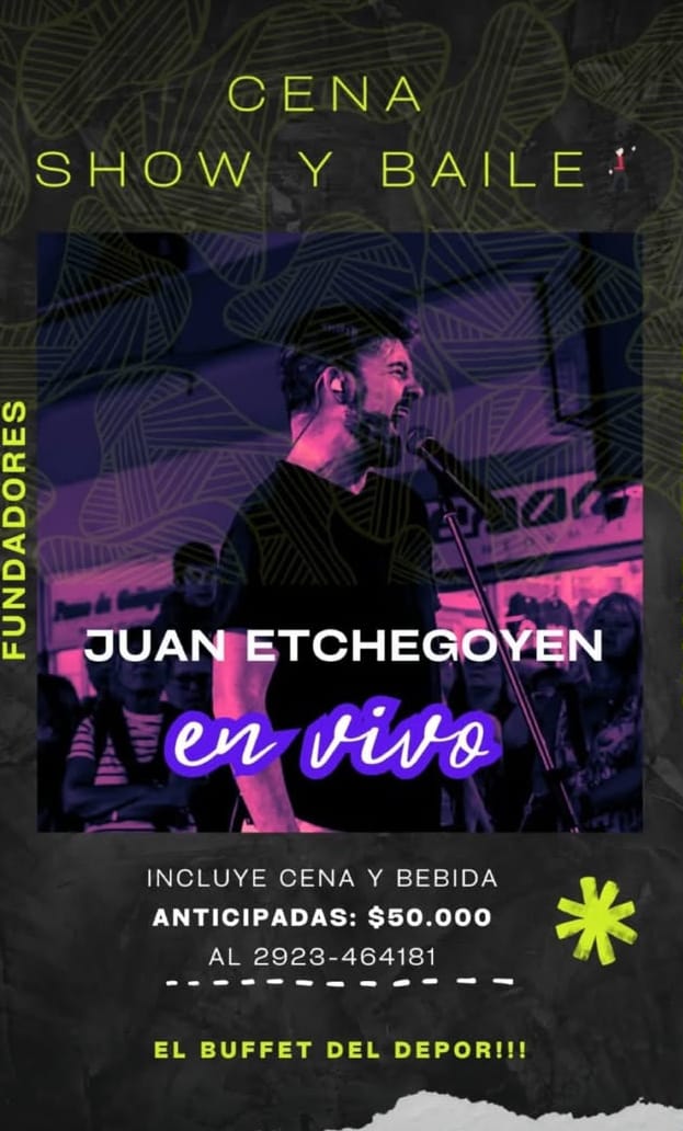 Gran cena show en el salón Fundadores del Club Argentino ✨ Si querés pasar una noche increíble, no te pierdas esta oportunidad!! Podés hacer las reservas en El Buffet del Depor todos los días de 19 a 23 hs o al 📲 2923 464181. Anticipadas $ 50.000