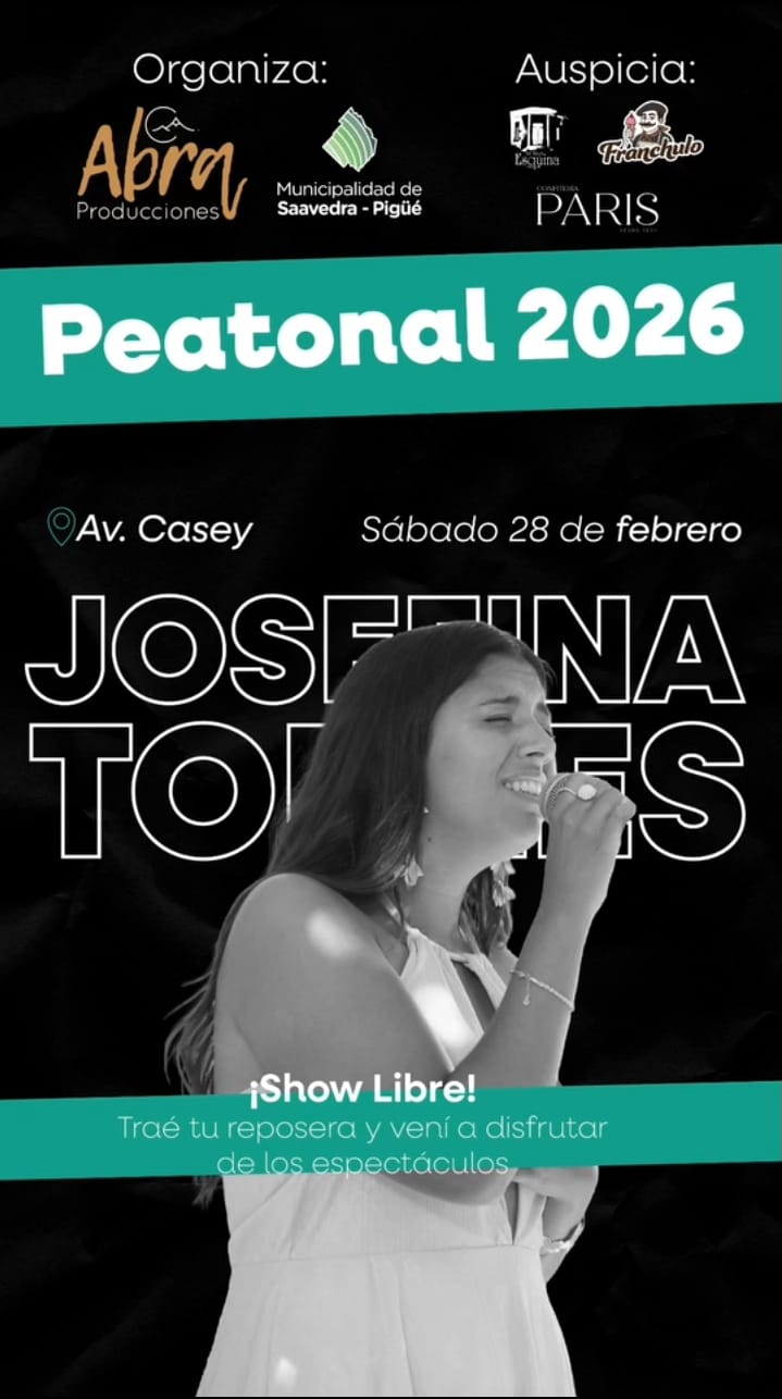 Seguimos con la peatonal en febrero ✨ 🎶Un espacio libre y abierto, para que vecinos, familias y visitantes puedan acercarse a disfrutar del show de manera gratuita. 🔥Y finalizando febrero hará su presentación Josefina Torres en la peatonal de Pigüé. Música en vivo, movimiento y encuentro, como nos gusta vivir el verano. Un proyecto colectivo […]