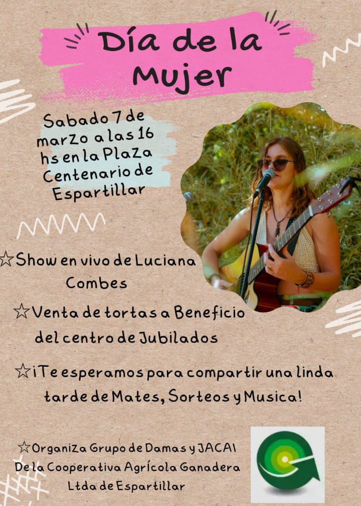 Te esperamos para vivir una linda tarde de mates, sorteos y música!!🧉🍰 El día 7 de marzo a partir de las 16:00 hs en Plaza Centenario de Espartillar con el show en vivo de Luciana Combes 🎶