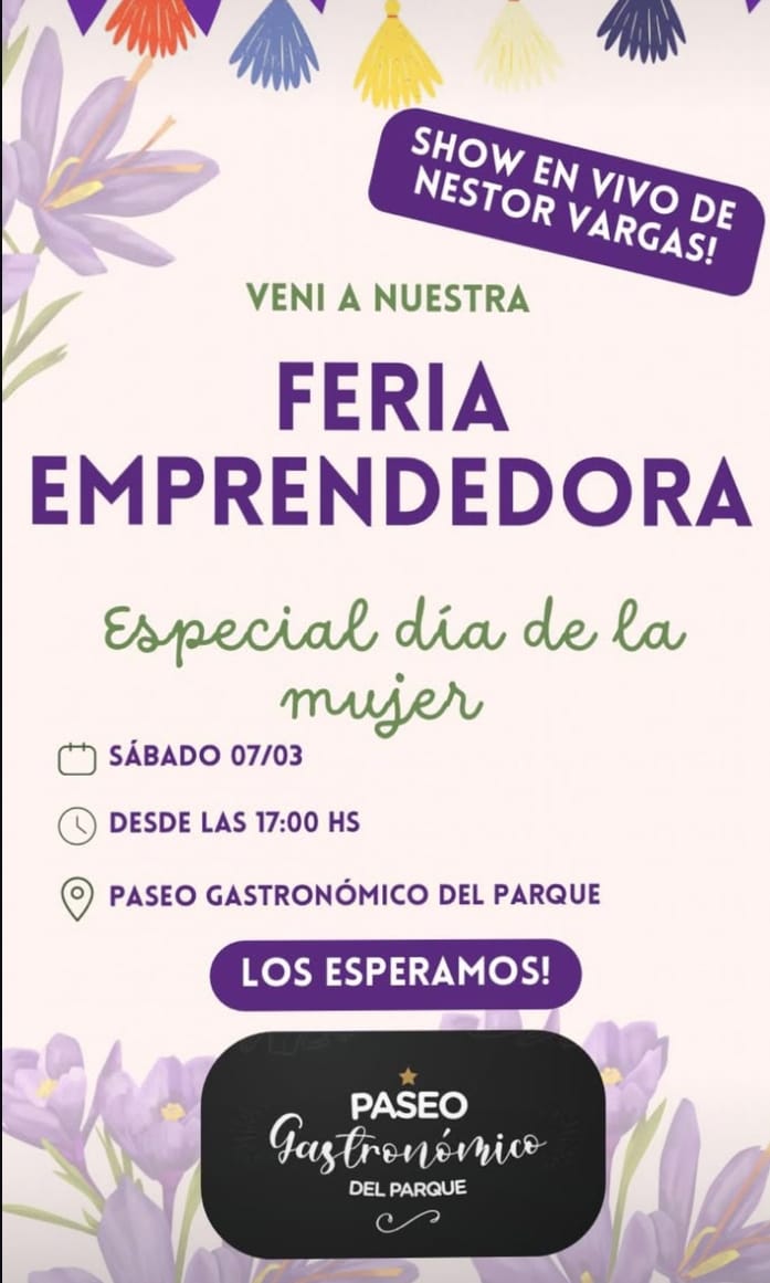 Este sábado 7 de marzo a partir de las 17:00 hs se va a estar realizando una Feria Emprendedora Especial Día de la Mujer, en el Paseo Gastronómico del Parque. También podrás degustar unas riquísimas 🍔con una 🍺y disfrutar del show en vivo de Néstor Vargas. Te lo vas a perder?
