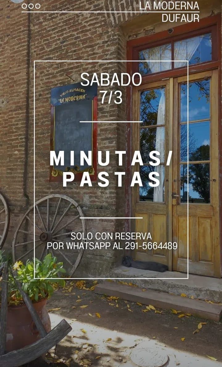 El sábado 7 de marzo a partir de 13:00 hs podrás degustar unas ricas minutas o pastas en Viejo Almacén La Moderna 🍽 Podes hacer tu reserva al 291 5664489. Te esperamos con la mejor atención!!