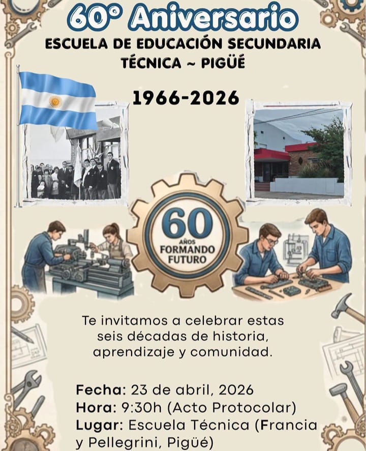 El acto protocolar será para conmemorar el 60° Aniversario de la Escuela Técnica N° 1 de Pigüé.