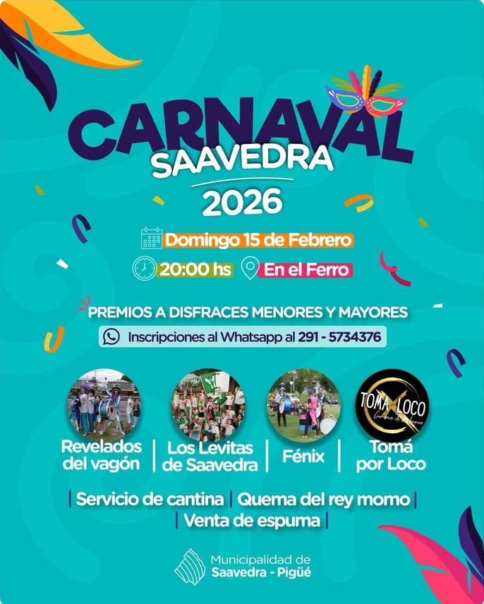 Noche de carnaval en Saavedra!! ✨ Diversión asegurada con “Tomá por Loco” a partir de las 20 hs en el club Ferro. Servicio de cantina. Quema del Rey Momo – murgas y premios. Inscripciones al 291 5734376📲