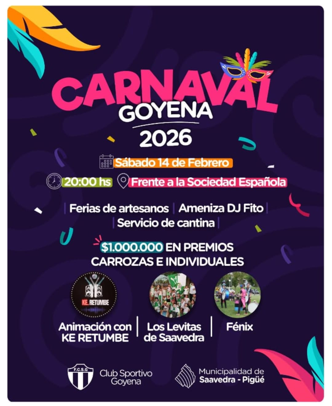 Se vienen los carnavales a Goyena!! 🤩 Presentación de murgas, feria de artesanos y esmerado servicio de cantina 🥟🍺 Ameniza Ke.Retumbe 🎤 $ 1.000.000 en premios 💲 Una noche de diversión asegurada!! 💯