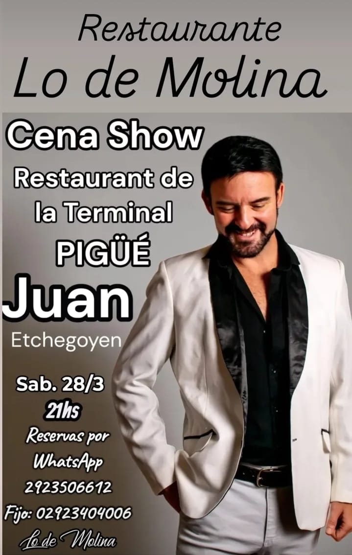 Restaurant Lo de Molina organiza una cena show para el 28 de marzo, con la presentación de Juan Etchegoyen. Podés hacer las reservas al whatsApp 2923 506612 o al 02923 404006 (fijo) ¡Hacé tu reserva!