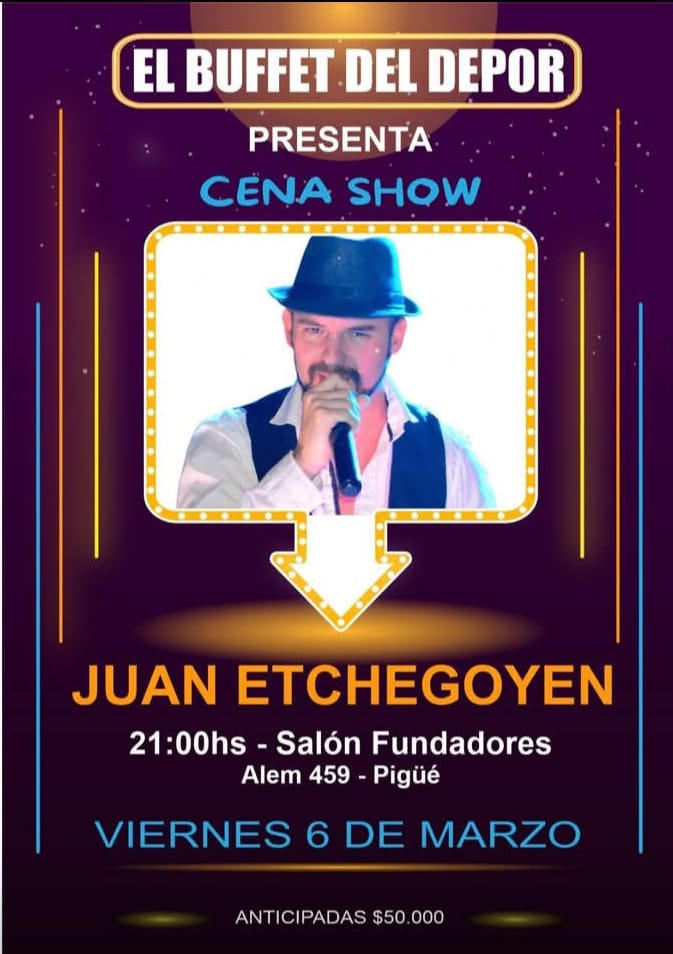 Gran cena show en el salón Fundadores del Club Argentino ✨ Si querés pasar una noche increíble, no te pierdas esta oportunidad!! Podés hacer las reservas en El Buffet del Depor todos los días de 19 a 23 hs o al 📲 2923 464181. Anticipadas $ 50.000