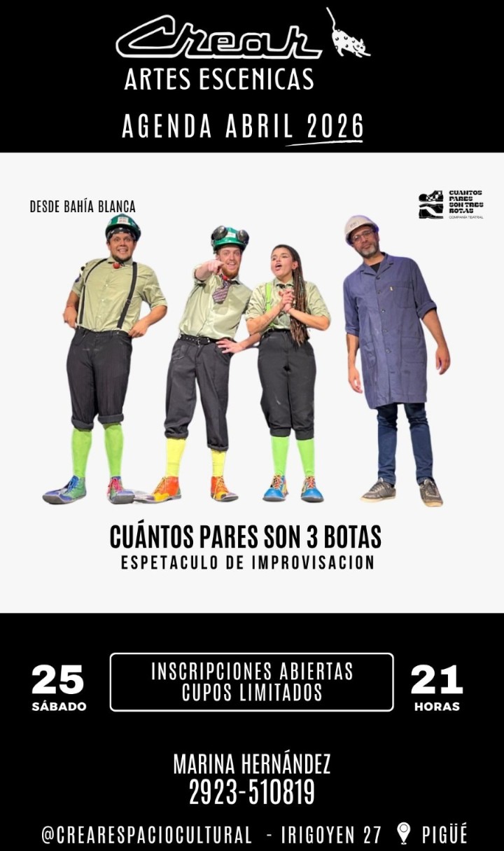 El sábado 25 de abril recibimos por primera vez en nuestro escenario a la compañía Cuantos Pares son Tres Botas. Llegan desde la ciudad de Bahía Blanca para ofrecer una noche de improvisación teatral y musical.