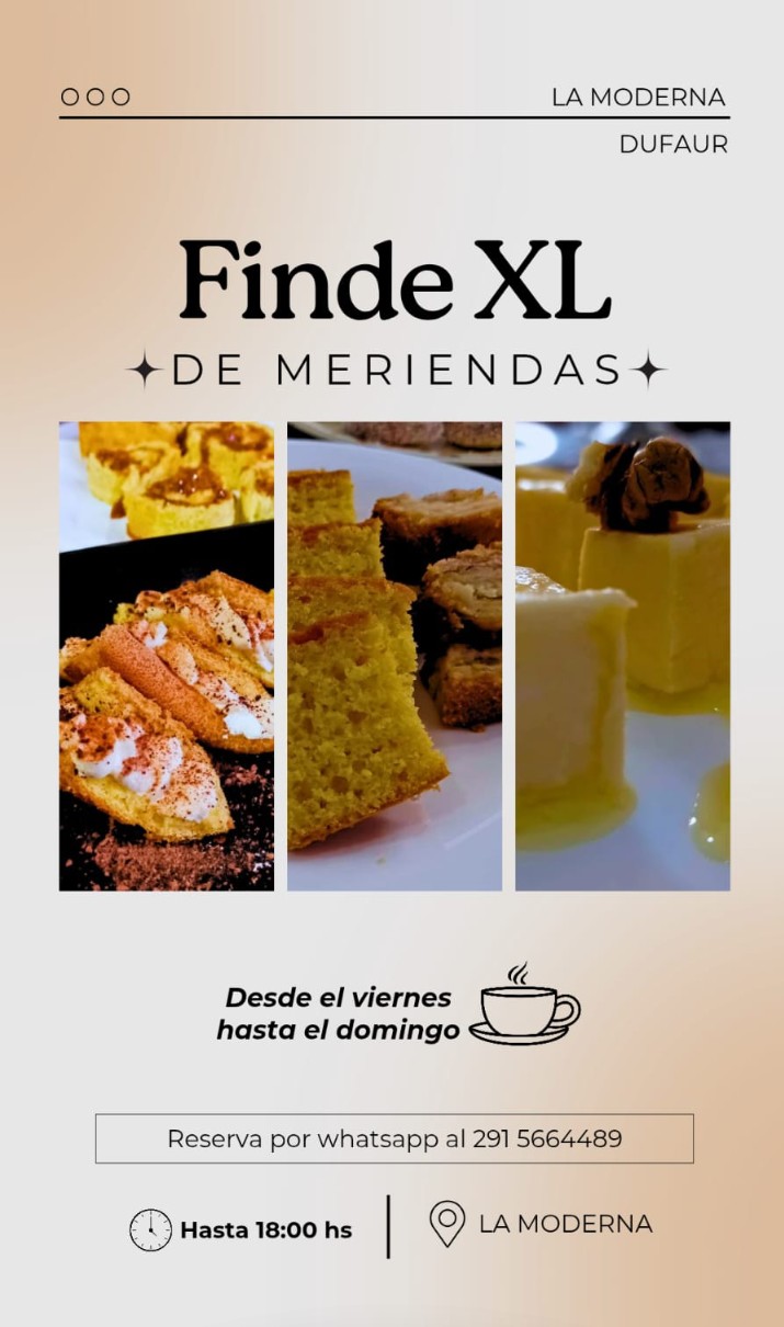 En este finde XL aparte de los ricos almuerzos sumamos merienda en Viejo Almacén La Moderna 🍰🍩🧁🍮 Reservá por WhatsApp al 291 5664489. Te esperamos!!