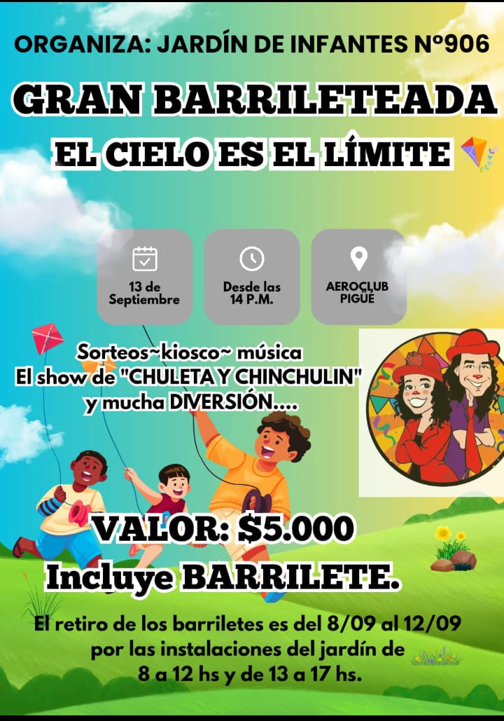 El Jardín de Infantes 906 organiza una barrileteada en el Aero Club, contará también con el show de “Chuleta y Chinchulín”, música, sorteos y un kiosco. Vení a participar y disfrutar de una tarde al aire libre!! 🌞💯