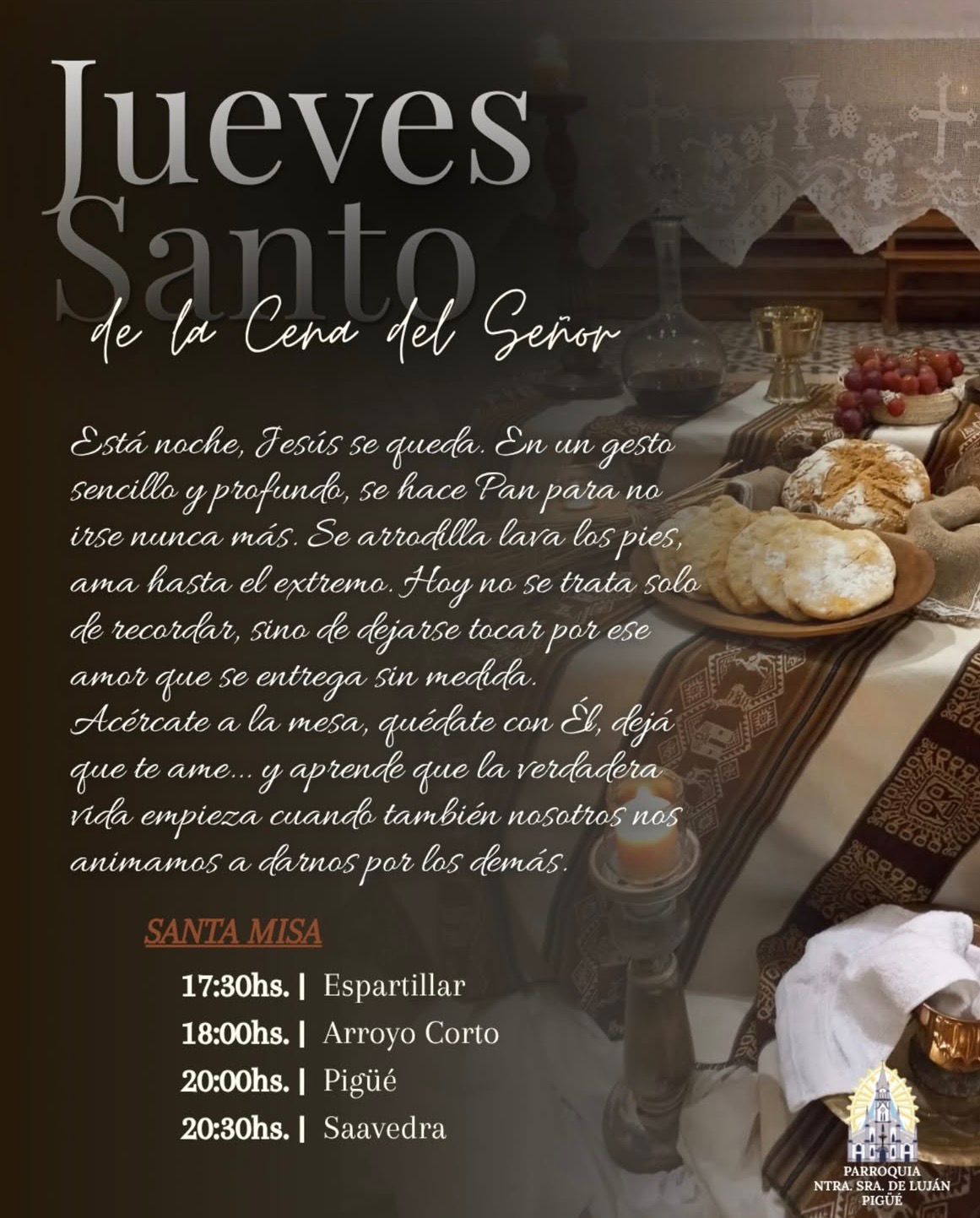 SANTA MISA 17:30 hs – Espartillar 18:00 hs – Arroyo Corto 20:00 hs – Pigüé 20:30 hs – Saavedra