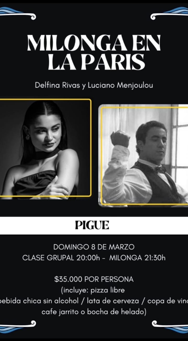 En la noche del domingo 8 de marzo habrá Milonga en La Paris, con Delfina Rivas y Luciano Menjoulou. Entrada por persona $ 35.000 (incluye piza libre- bebida chica sin alcohol / lata de cerveza / copa de vino – café jarrito o bocha de helado)