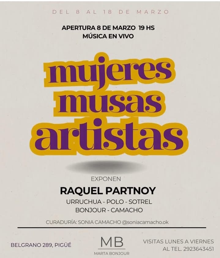 La puesta en escena se desarrollará desde el día 8 de marzo, por la tarde, luego de las 19:00 hs, contando con la presentación de las obras de Raquel Partnoy, Urruchua, Polo, Sotrel, Marta Bonjour y Sonia Camacho.