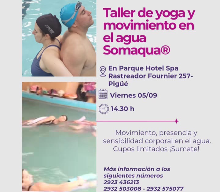 Se va a estar realizando un taller de Yoga y Movimiento en el agua 🤽♂️ en el Parque Hotel Spa el día 5 de septiembre. El cupo es hasta 25 personas y es abierta a todo público. 📳 Podes hacer reservas al 2923 436213 / 503008 / 575077.